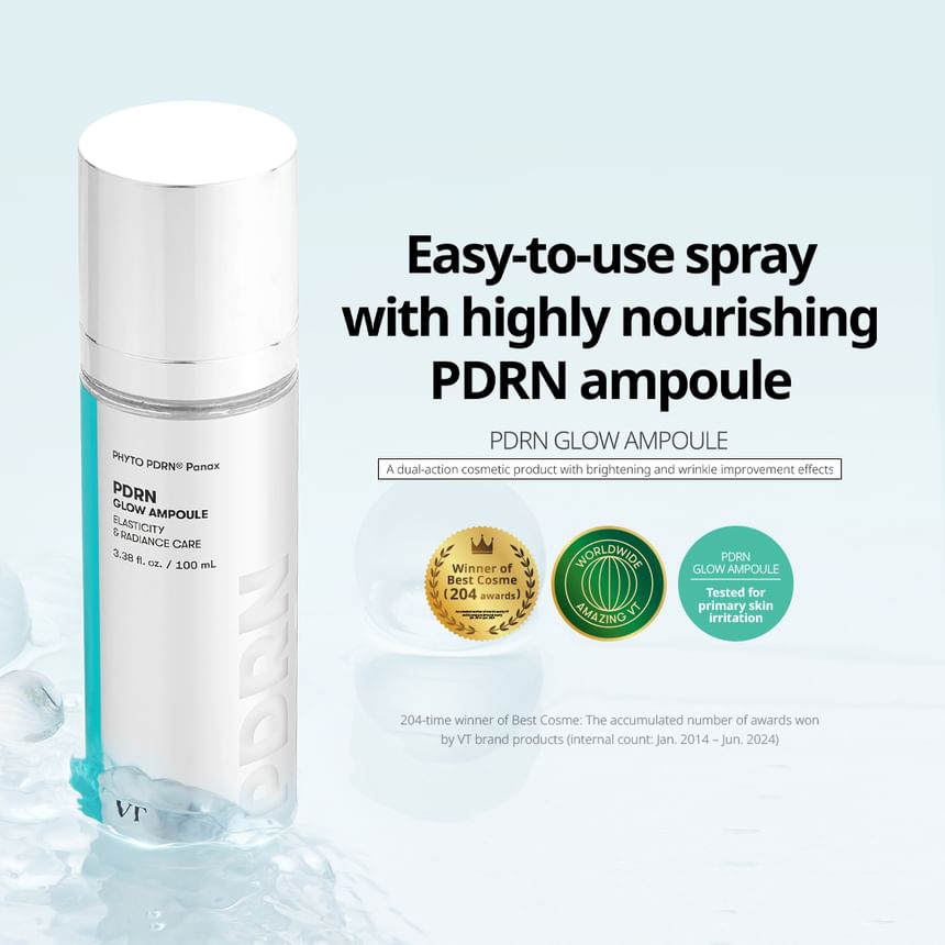 The PDRN Glow Ampoule has a lightweight, slightly viscous consistency that absorbs quickly without leaving a sticky residue. It is applied after cleansing and before a moisturiser. A few sprays are sufficient for full-face coverage, and the formula spreads evenly with minimal effort.